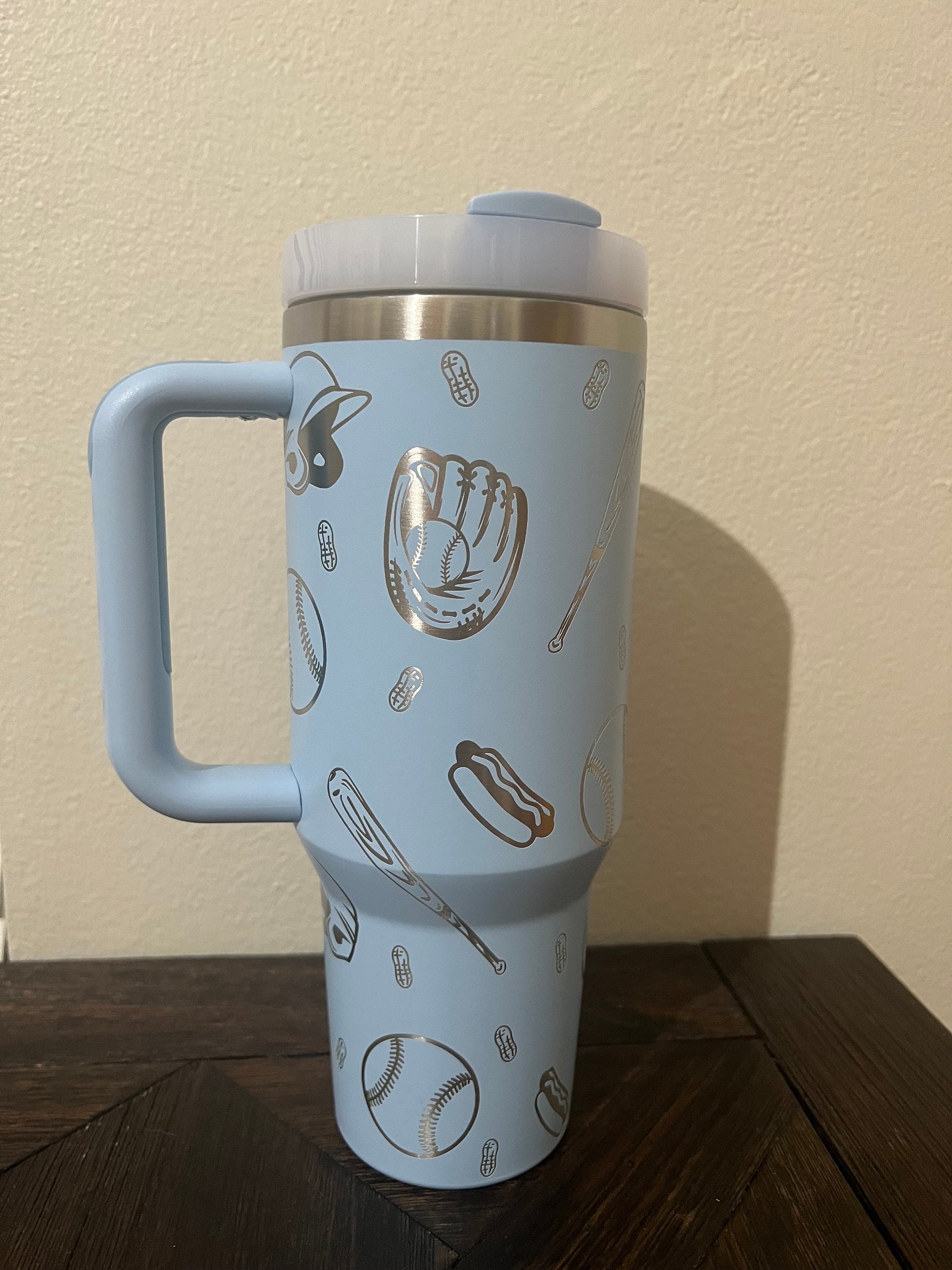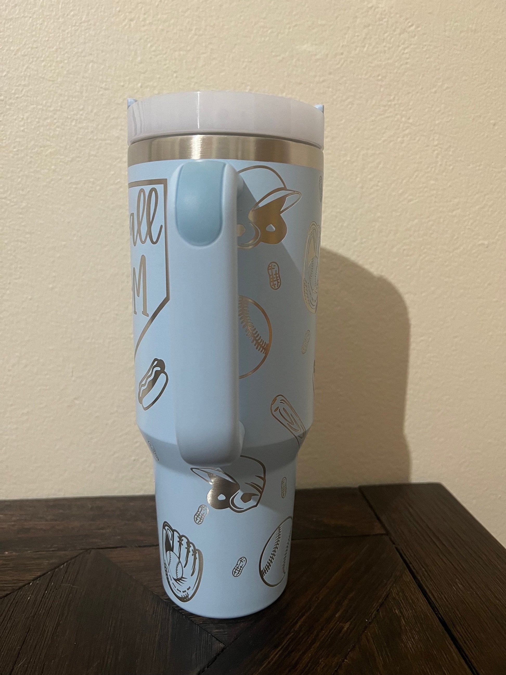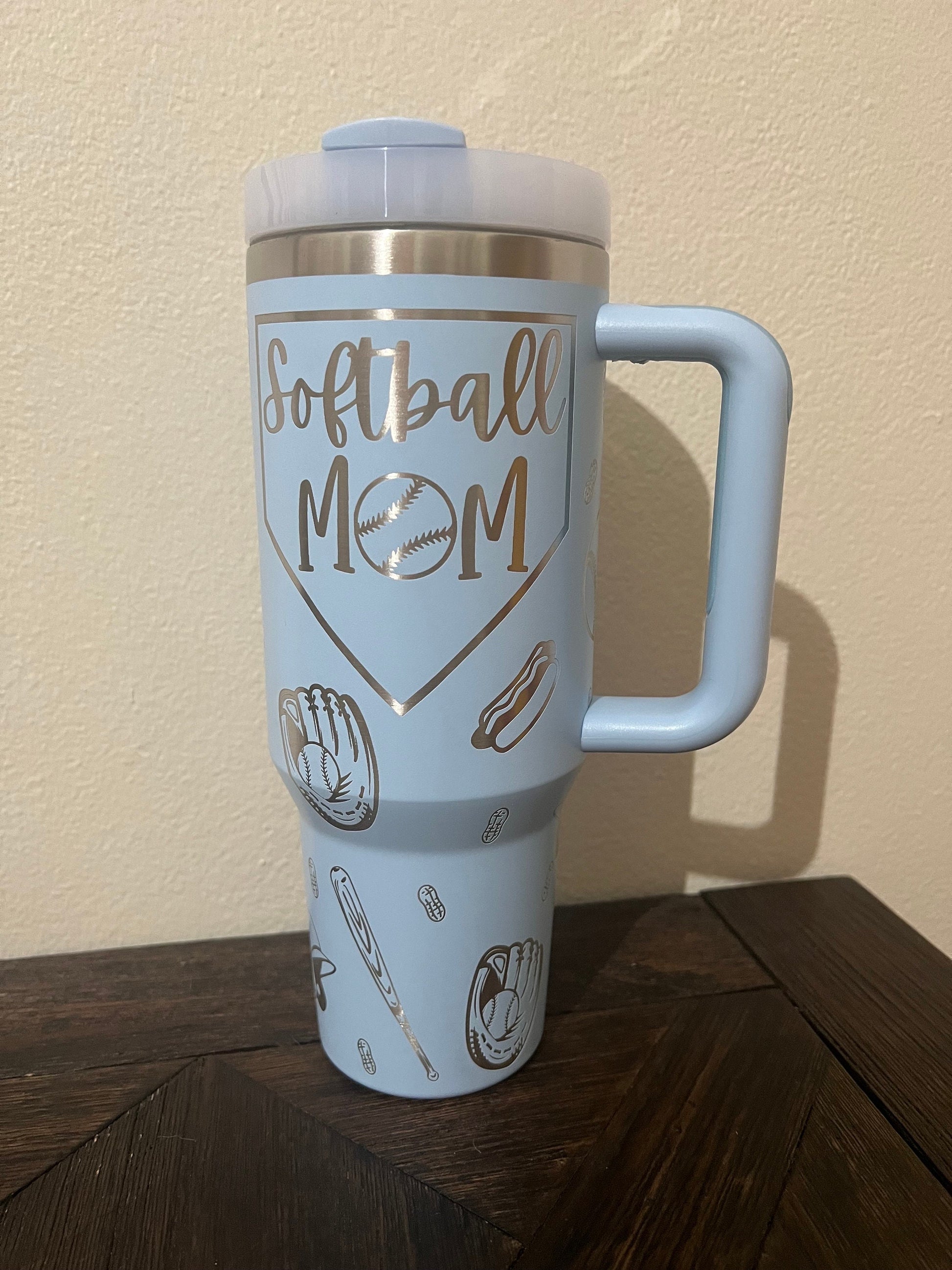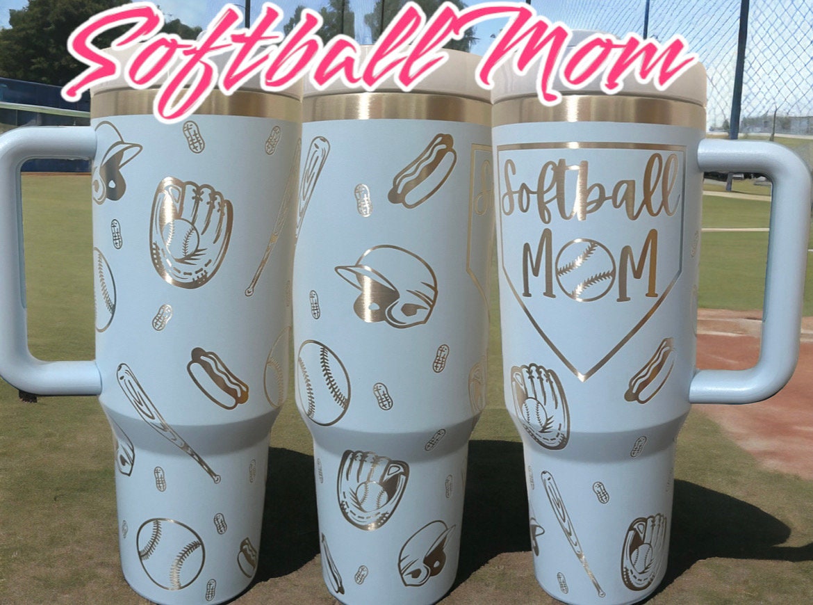 Unbranded Softball Mom 40 oz double insulated tumbler.
