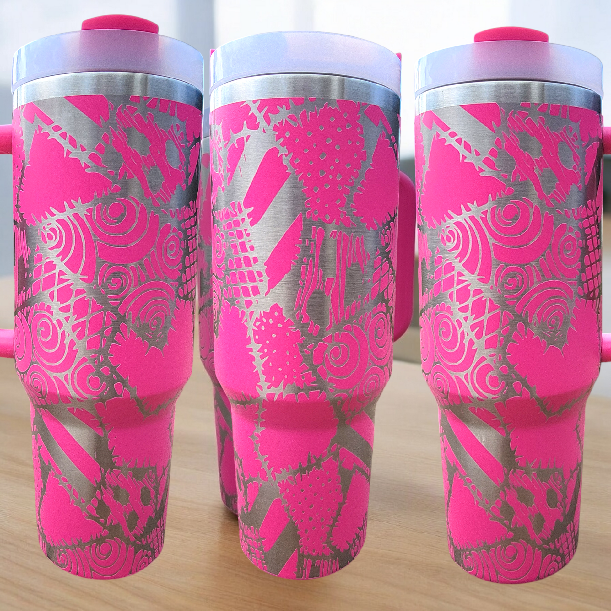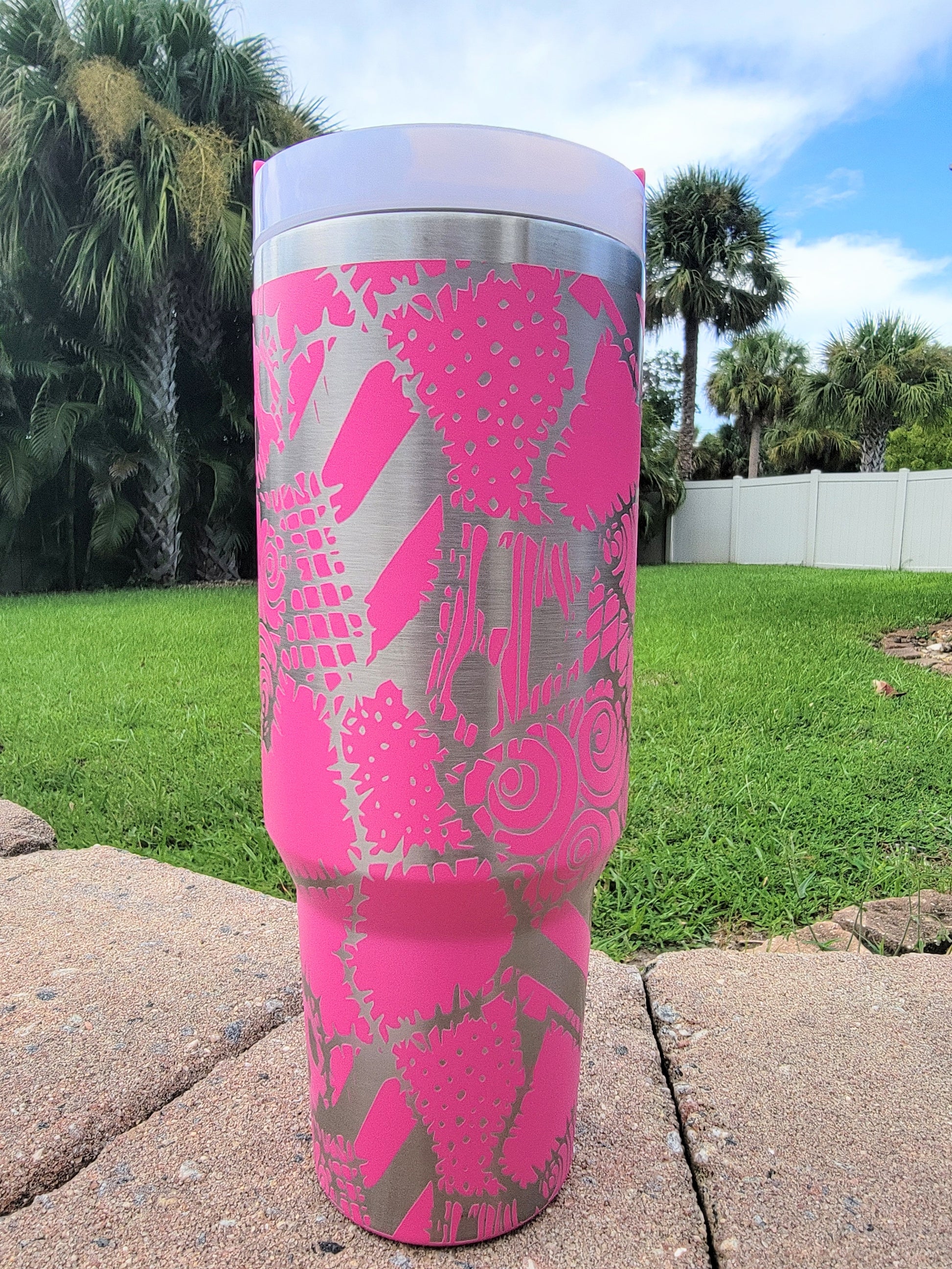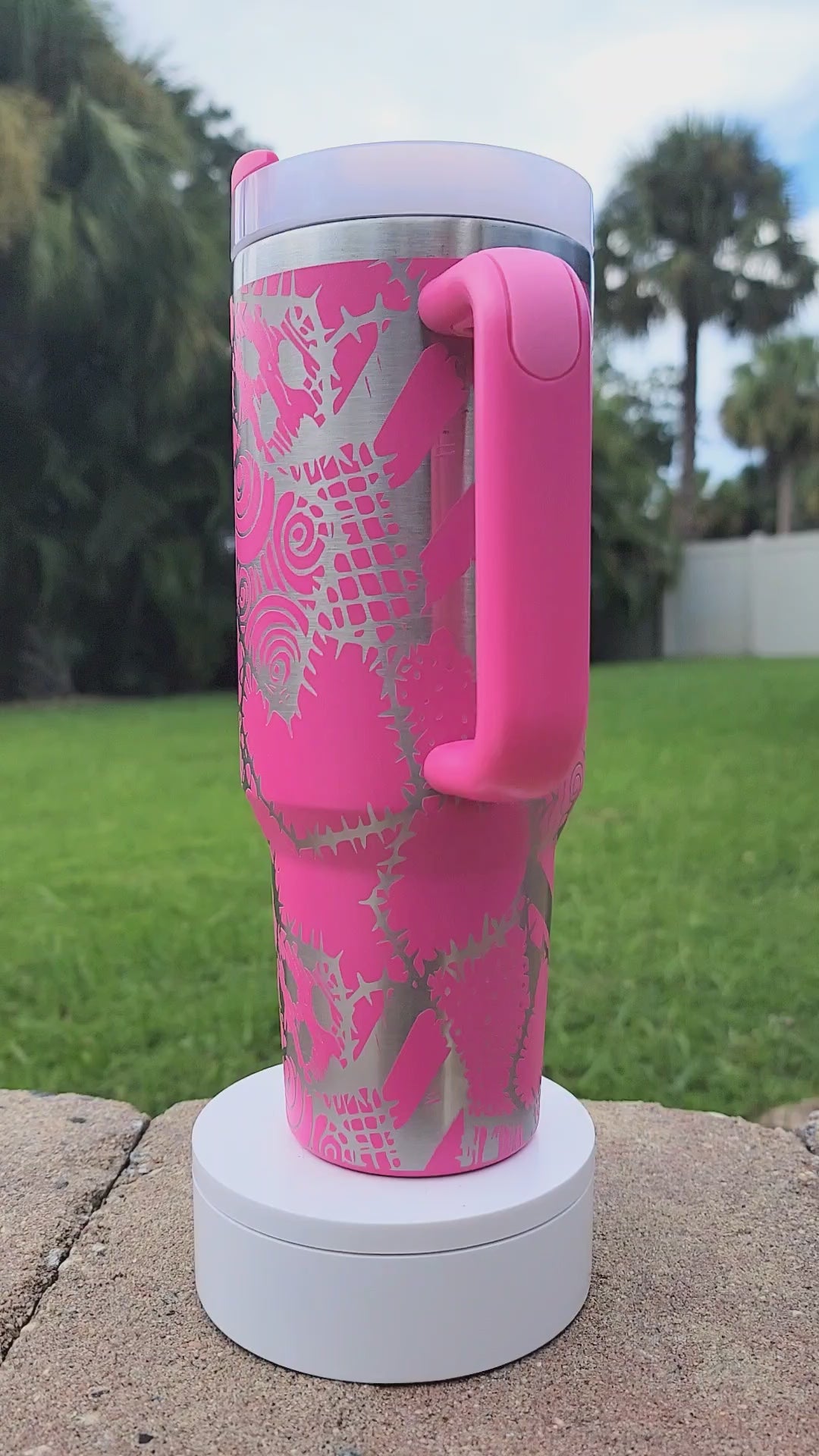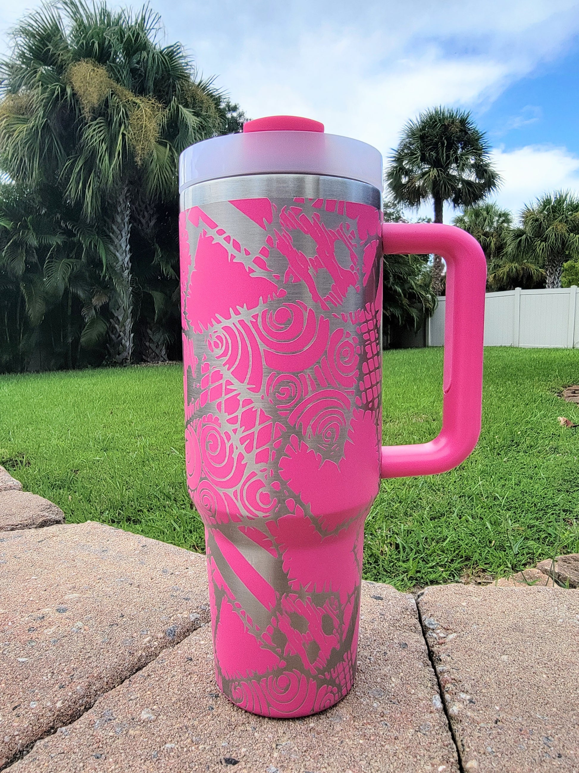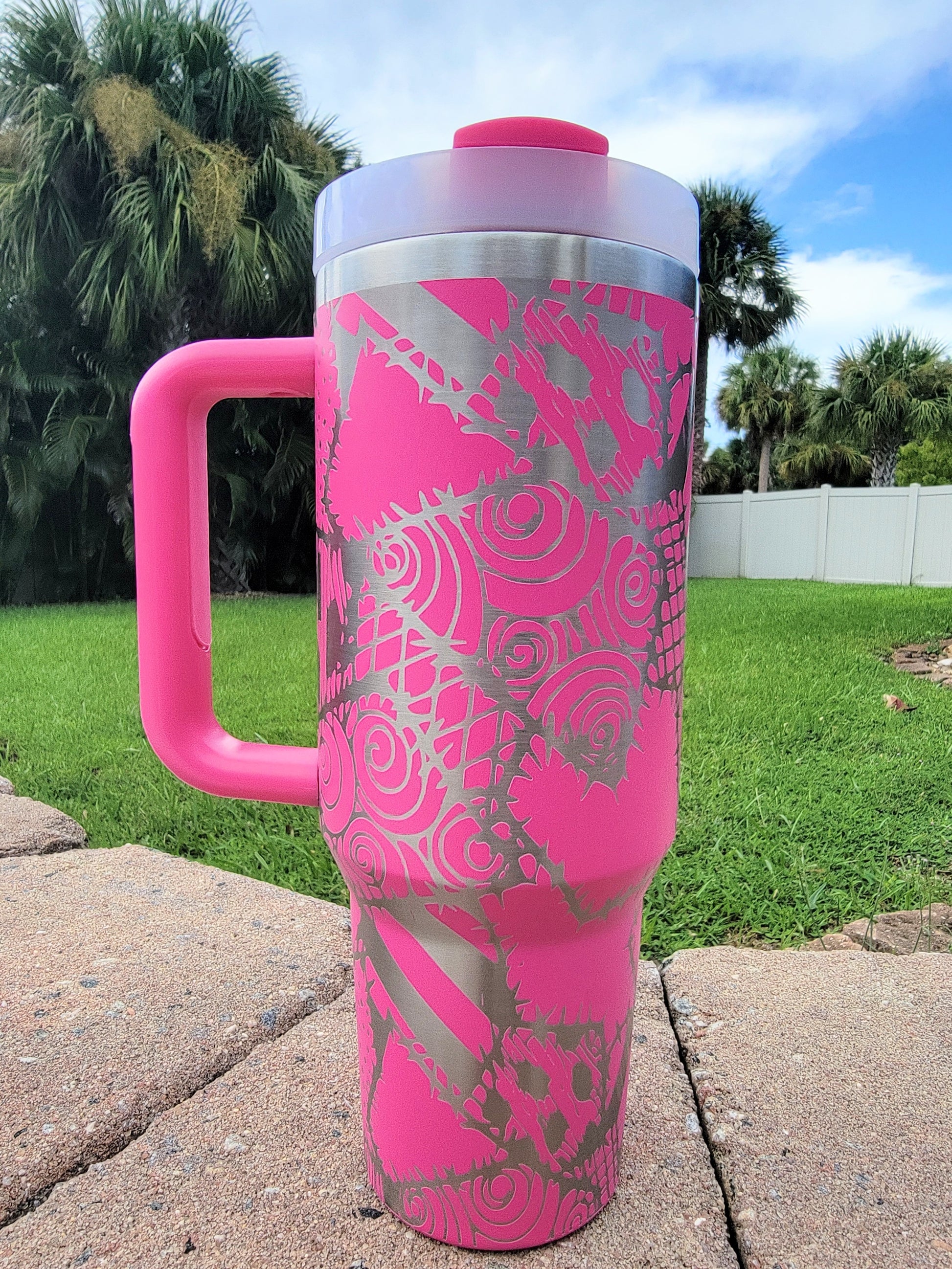 This is laser engraved powder coated stainless steel that can be used for cold or hot drinks. Do not microwave, it is metal. Dishwasher safe, but handwashing is recommended.